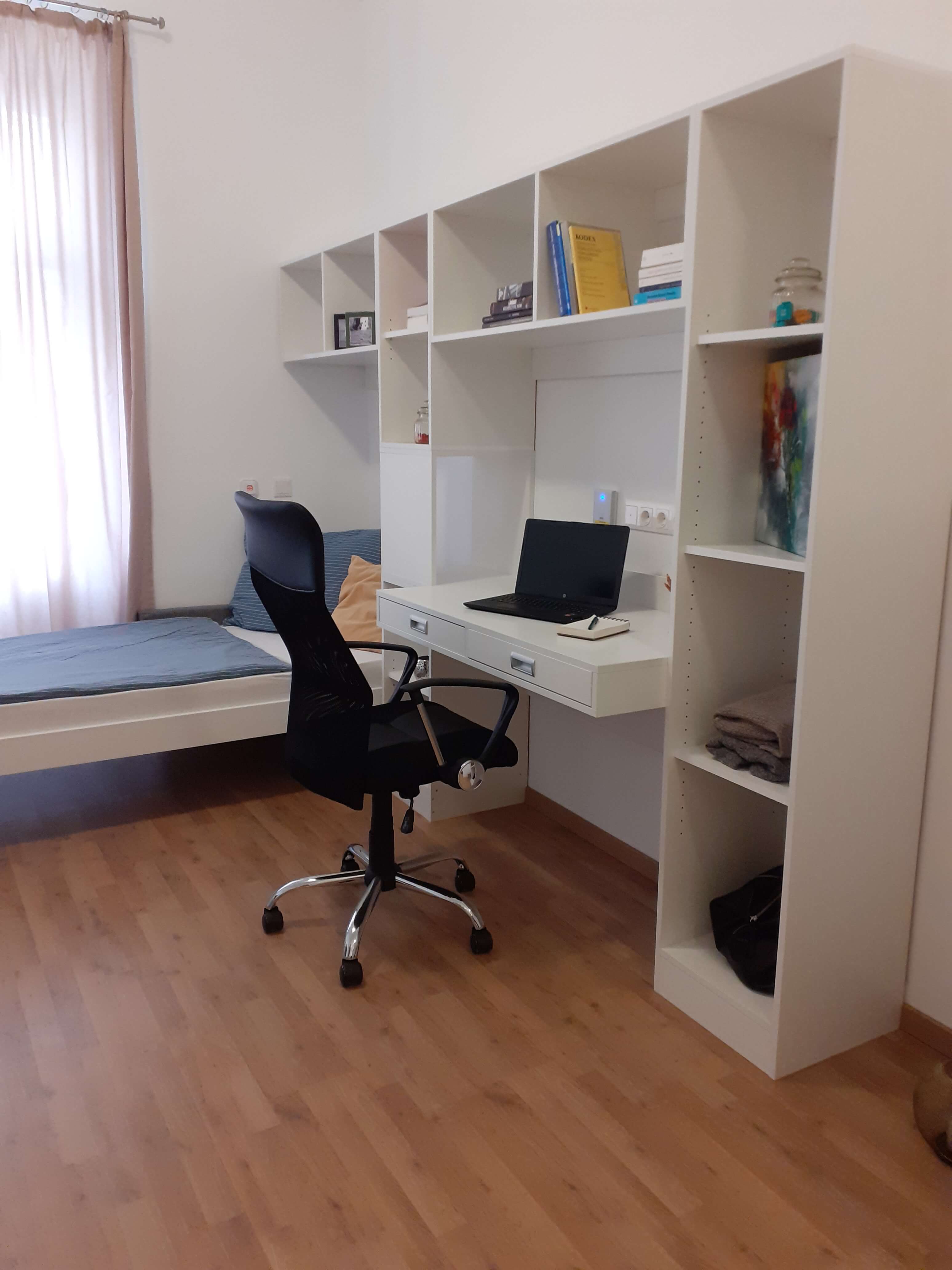 - und ein Bad mit WC, Dusche, Waschbecken und Spiegelschrank.