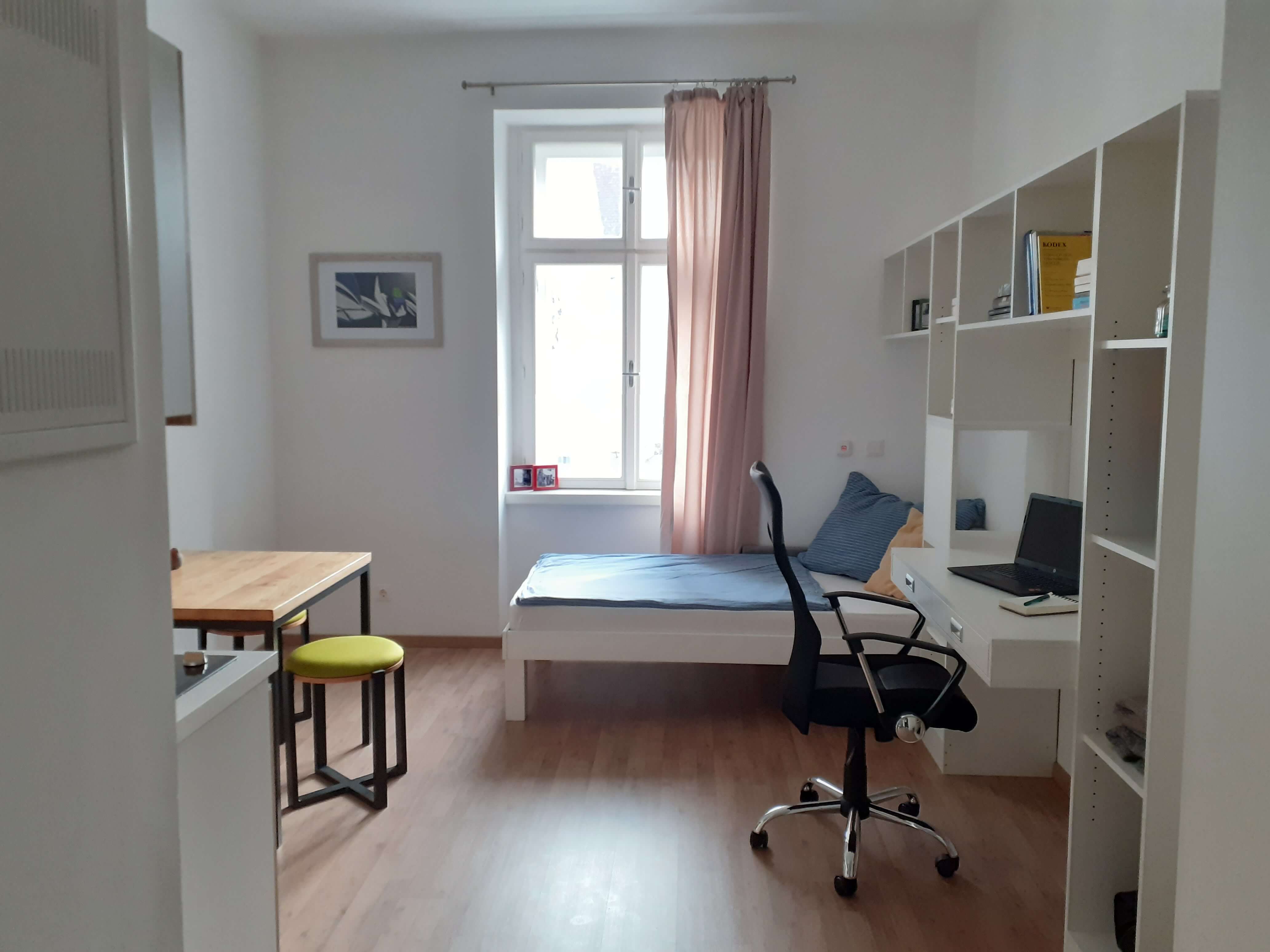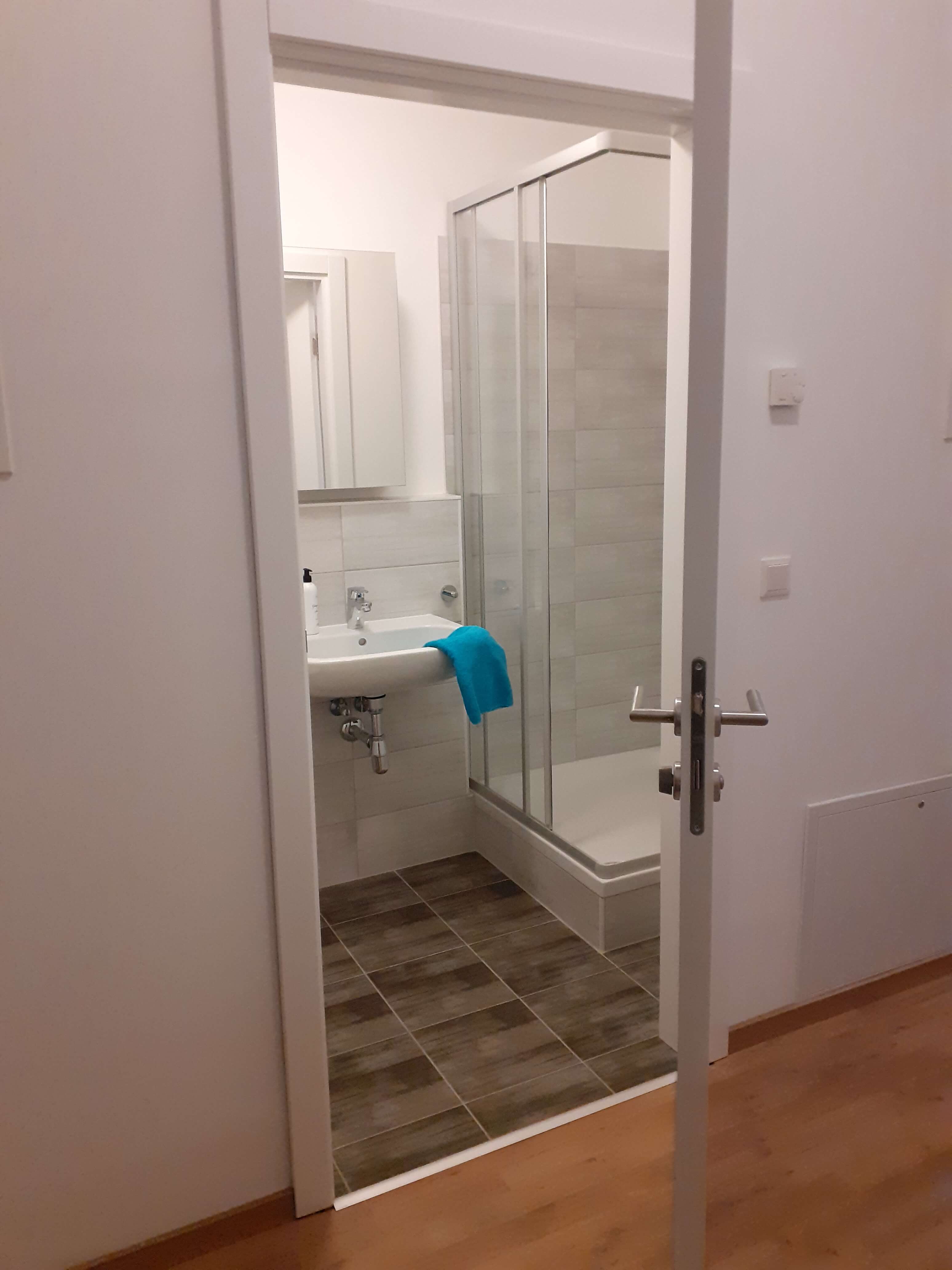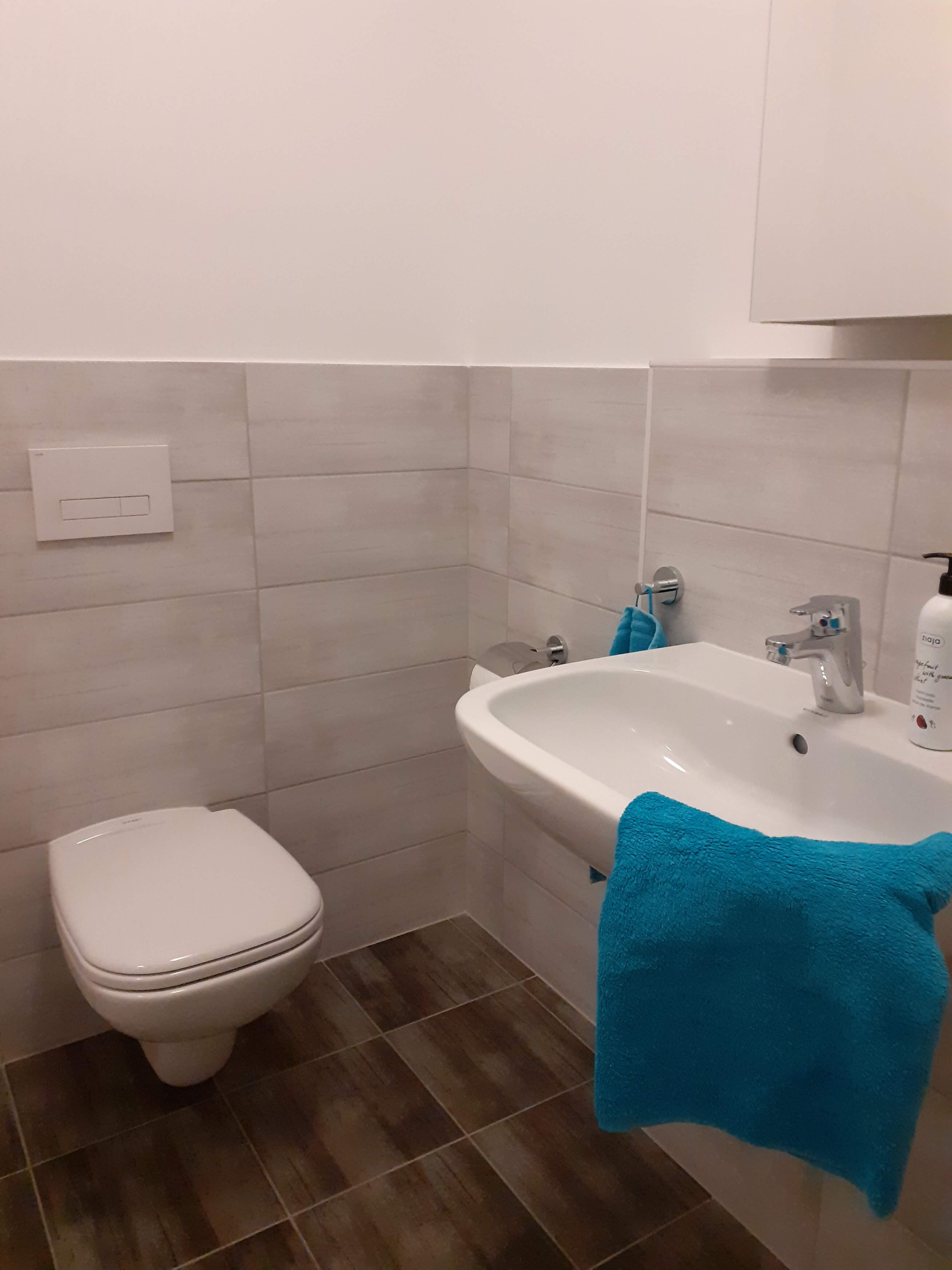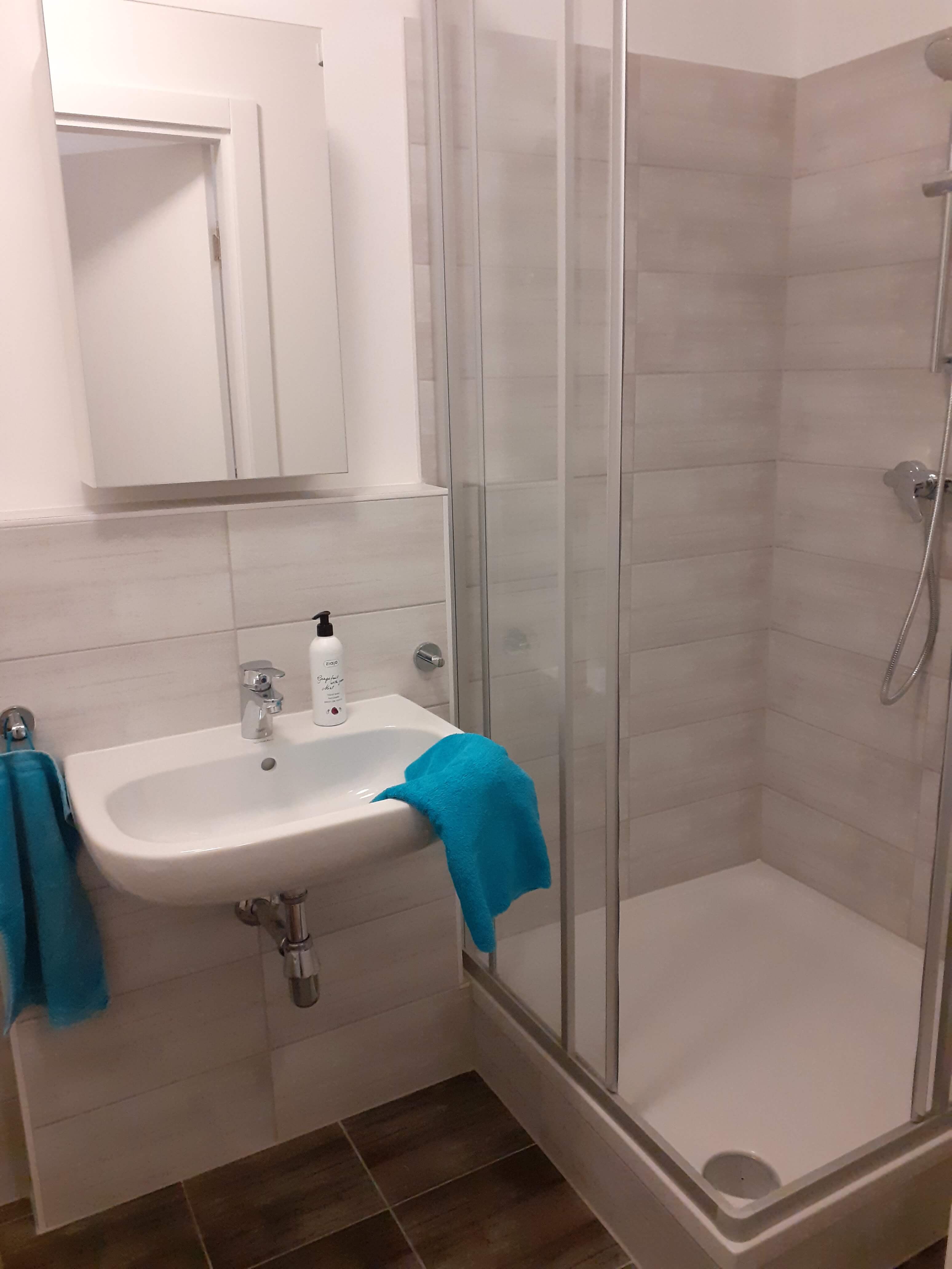 - und ein Bad mit WC, Dusche, Waschbecken und Spiegelschrank.
